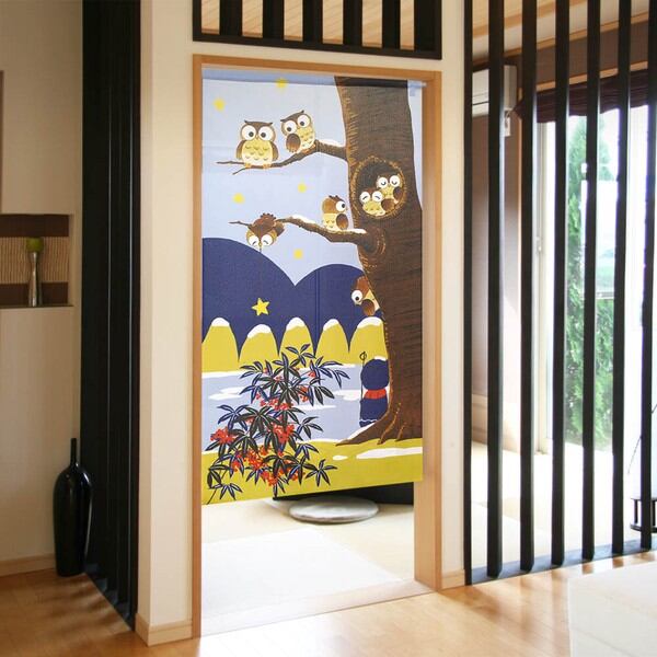 のれん 受注生産 目隠し 「フクロウと地蔵」 日本製 和風 縁起物 フクロウ / 家具・インテリア ファブリック・敷物