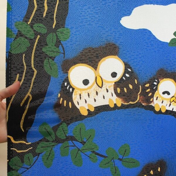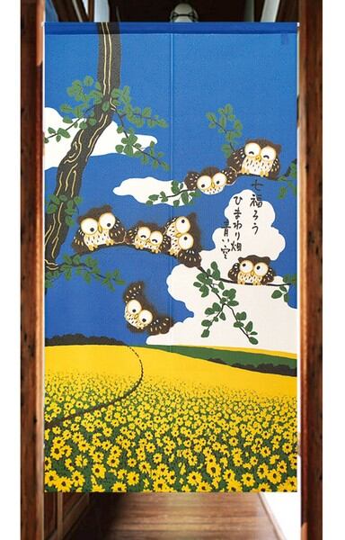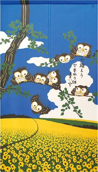 のれん 受注生産 目隠し 「七福ろうひまわり畑」 日本製 和風 縁起物 フクロウ / 家具・インテリア ファブリック・敷物