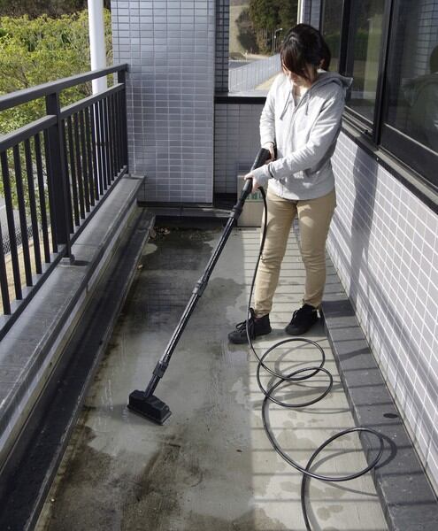 水はねを抑え、隅々まで洗える構造のブラシで、ベランダなどの洗浄に適しています