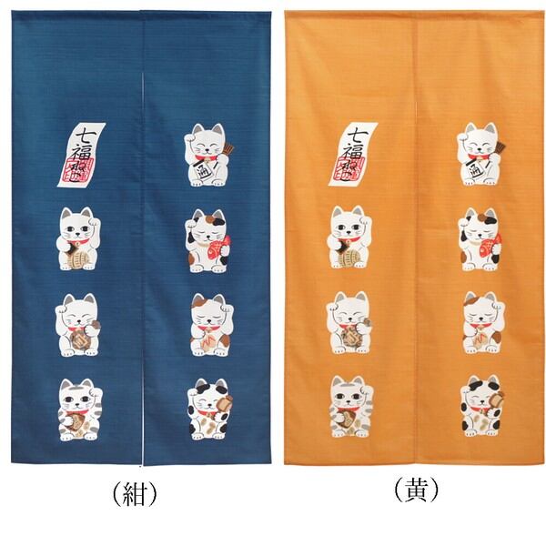 のれん 目隠し 85X150cm 綿100%「七福ねこ 黄 / 紺」 日本製 和風 / 家具・インテリア ファブリック・敷物