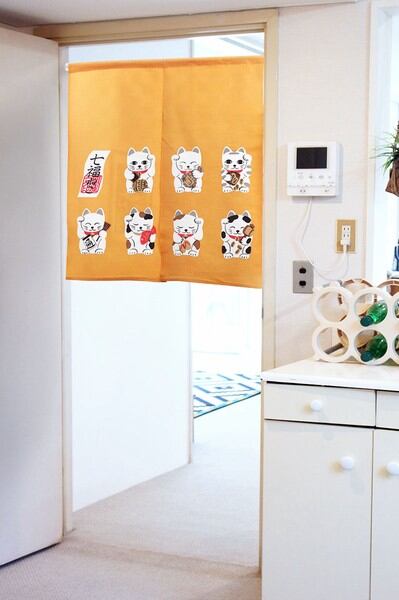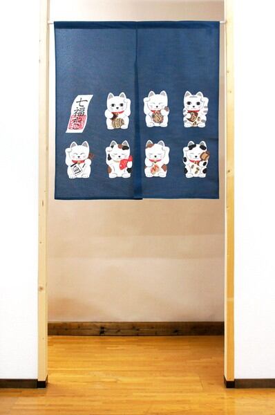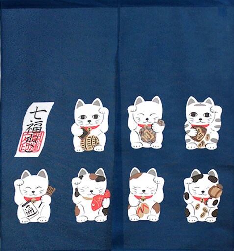 のれん 目隠し 85X90cm ポリエステル100%「七福ねこ2 黄 / 紺」 日本製 和風 / 家具・インテリア ファブリック・敷物