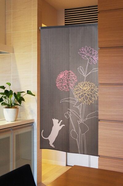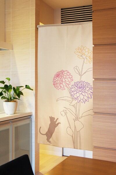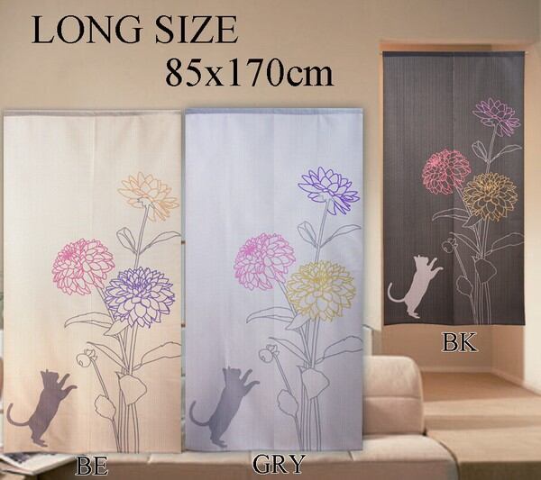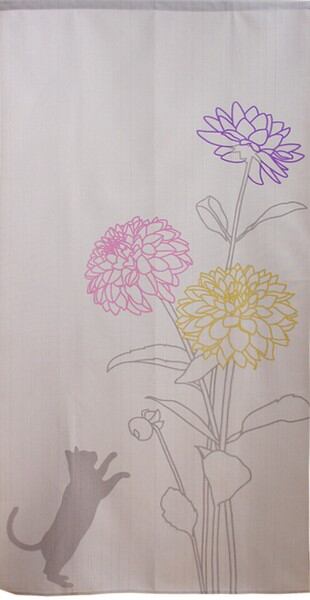 のれん 目隠し 85x170cm「ネコとダリア」ロングサイズ 日本製 / 家具・インテリア ファブリック・敷物
