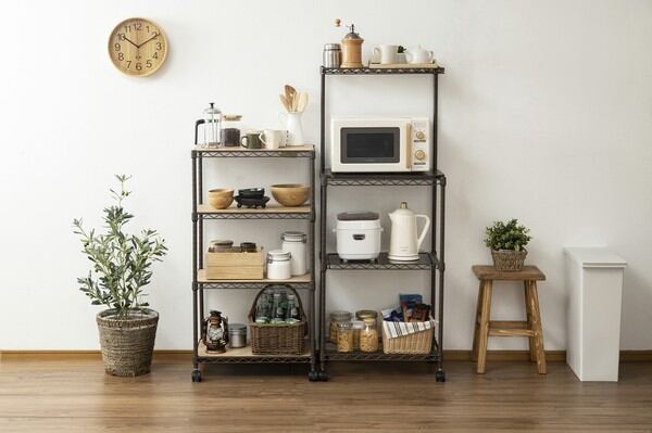 ■素材・成分:棚板・ポール:スチール(粉体塗装)、固定部品:ABS樹脂、スリーブ:ポリプロピレン、キャスター:スチール、ナイロン樹脂、ウッドボード:合成樹脂化粧繊維板(塩化ビニル樹脂・MDF)