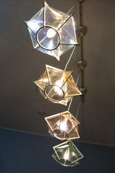宝石のようなガラスシェードを、シャンパンゴールドのアームで包み高級感のあるペンダントライト