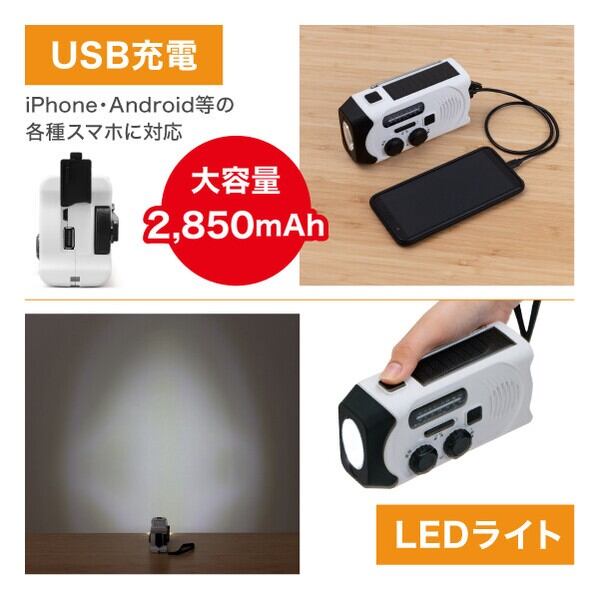●●受信周波数:AM522〜1620kHz、FM76〜108MHz●入力端子:USBMicro-B(DC5V)●出力端子:USBType-A(DC5V-1A以下)●防滴性能:IPX3●LEDライト:全拘束80lm昼光色●充電池:3.6V/2,850mAh(リチウムイオン電池)●付属品:USBケーブル約50cm(Micro-B/Type-A)、ストラップ、取扱説明書■充電時間の目安〇手回し充電※130回転/分で充電した場合:約4.5〜5時間〇ソーラーパネル充電※平均86,000lxの太陽光の下の場合:約90〜100時間〇USB充電※DC5V/0.9A:約4〜6時間■使用時間の目安〇AM/FMラジオ※中音量の場合:手回し充電※130回転で1分間充電した場合、約5分〜7分/満充電時の連続使用時間、約25時間〇LEDライト:手回し充電※130回転で1分間充電した場合、約10分点灯/満充電時の連続使用時間、約13時間点灯〇SOSアラーム:手回し充電※130回転で1分間充電した場合、約5分/満充電時の連続使用時間、約7時間点灯〇スマートフォン:連続通話時間;満充電時の連続使用時間、約2時間※2/連続待ち受け時間;満充電時の連続使用時間、約10時間※2※2通話時間や待ち受け時間はお使いの機種やバッテリーの状態によって使用状況が大きく変わることがあります