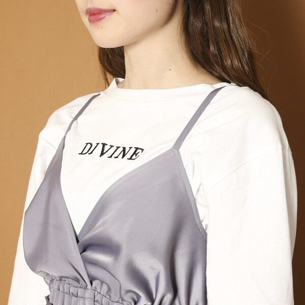 セットアイテムなのでトレンドのレイヤードコーデも簡単に出来ちゃう♪光沢感が魅力のキャミワンピは高めのウエスト位置で自然にスタイルアップ♪アジャスター付で調節も可能です◎刺しゅうロゴ入りのロンTはシンプルなので単品でも使いやすい◎