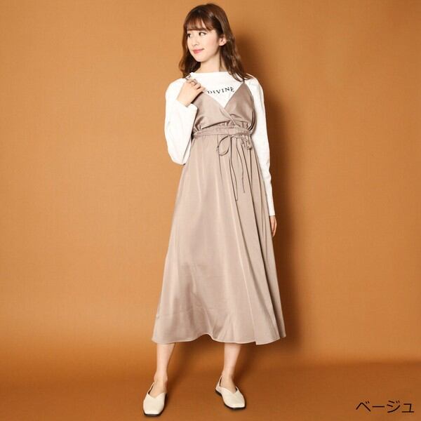 キャミワンピ/ワンピース/フレア/ロング/セット/インナー/ロンT/光沢/ロゴ/刺しゅう/2110940