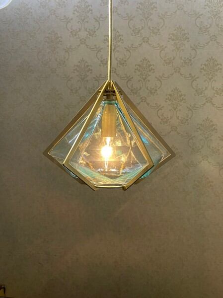 宝石のようなガラスシェードを、シャンパンゴールドのアームで包み高級感のあるペンダントライト