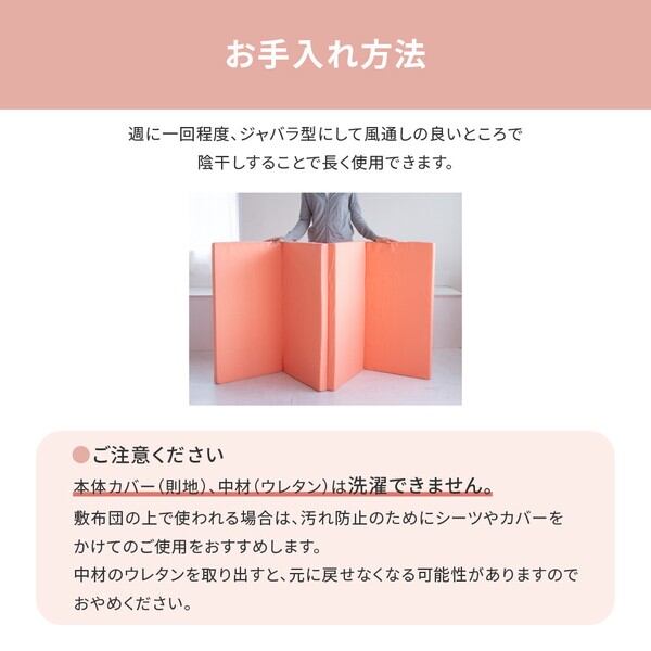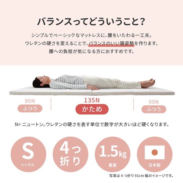 ・シングルサイズ、硬さ:腰部分硬め、厚さ約5cm、4つ折りタイプ、1.5kg、日本製