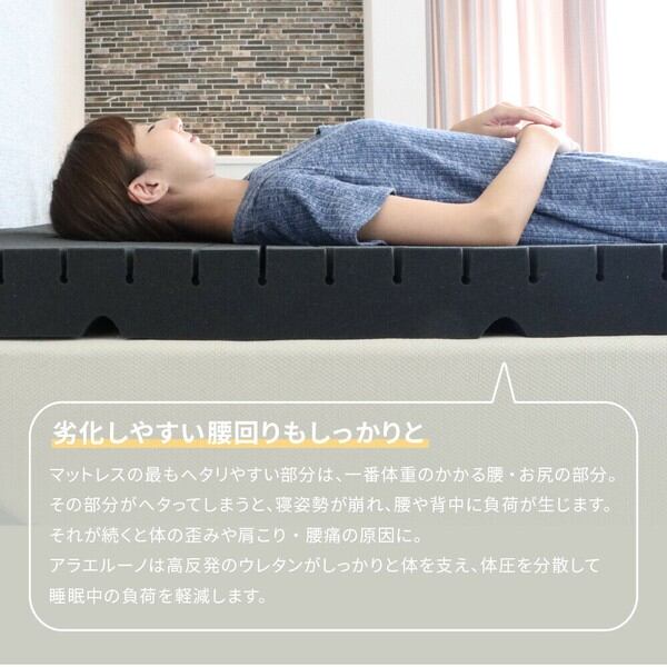 ヘタりやすい腰やお尻の部分もしっかり支える高反発で、睡眠中の負荷を軽減し快適な眠りへと導きます