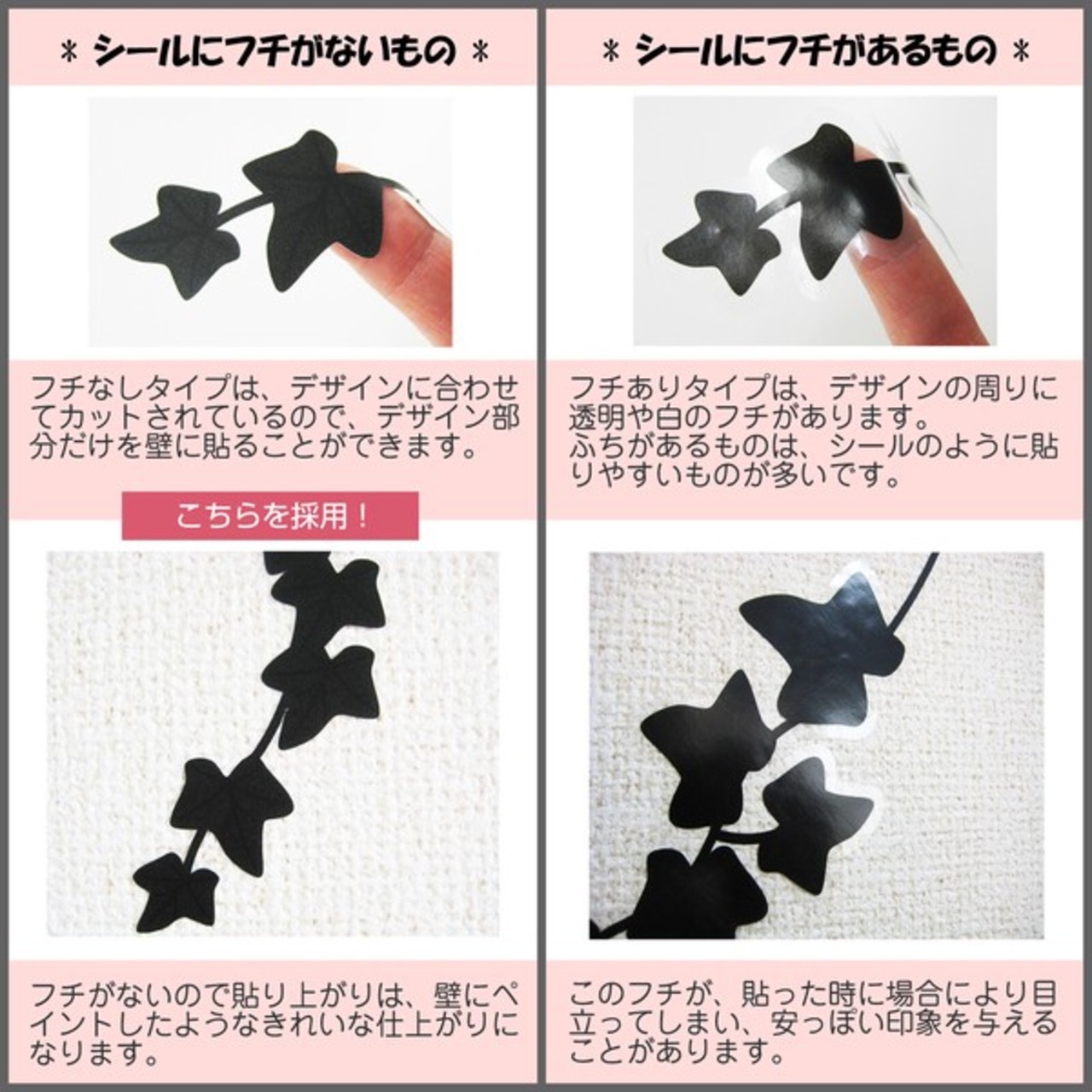 一般的なシールタイプのウォールステッカーの多くはデザインの周りに透明のフチがあり、貼った時にフチが目立ったり、反射してテカテカしたりして「安っぽい印象」となりますが、転写タイプはデザインにそって非常に細かくカットされデザイン部分のみを壁に貼れるので、壁にペイントしたようなクオリティーを実現しています