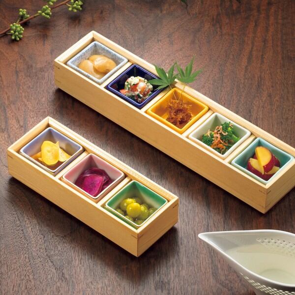 三ツ仕切と五ツ仕切に、セットする珍味入で彩りの変化も楽しめます