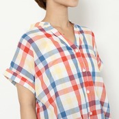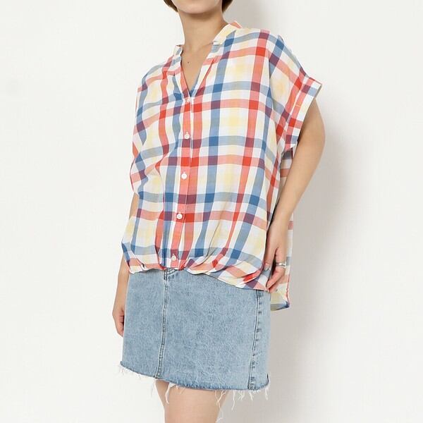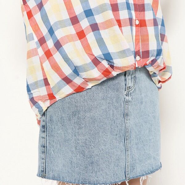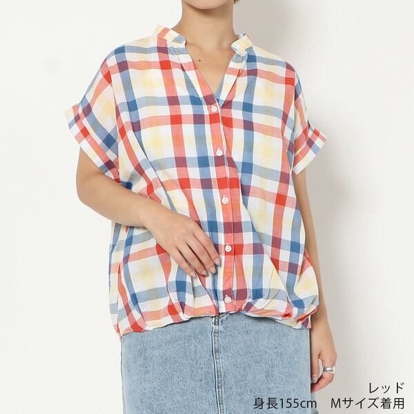 華やかなカラーリングのチェック柄で顔周りも明るく魅せてくれます♪さらっと肌触りの良いコットン100%なのも嬉しいポイント☆存在感のあるデザインブラウスなのでデニムに合わせるだけでオシャレな1枚♪