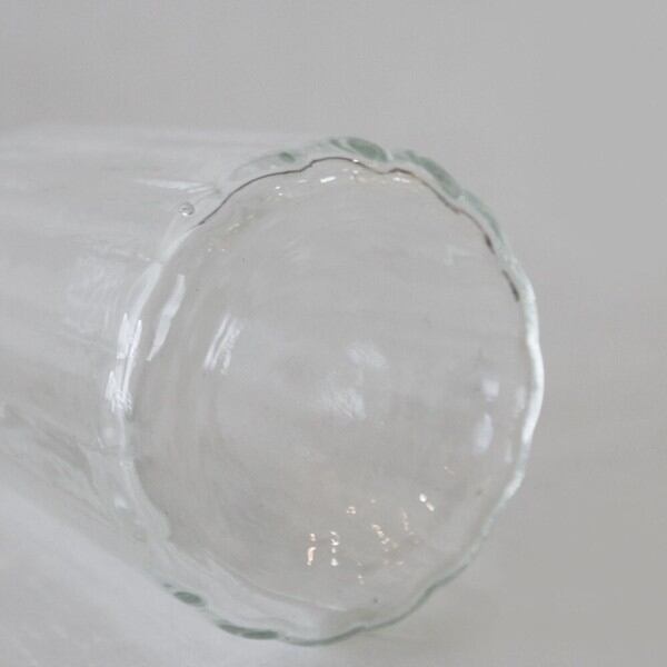 ガラスの流れや小さな気泡、口の部分に盛り上がった箇所などがあったりしますが、これは吹き竿からガラスをカットした後、熱処理した時にガラスが流れて出来るもので、これもまた吹きガラスの特徴です