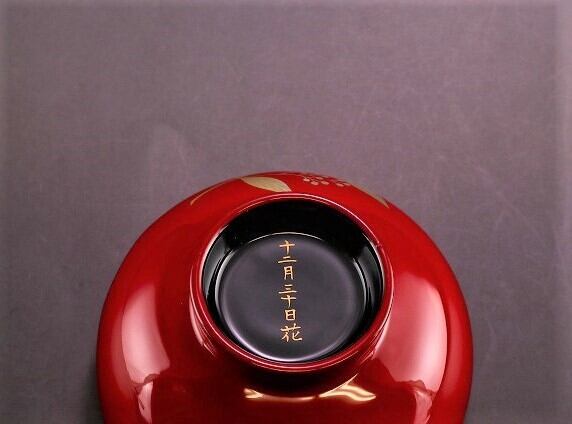 手にぴったり収まるサイズの汁椀。漆塗装なので、熱い汁物を入れても熱が伝わりにくい!お色は黒内朱と朱色の2色。こちらは全体が朱色で底が黒色。お椀の底には十二月三十日の文字入りです。