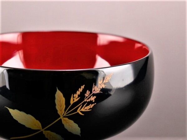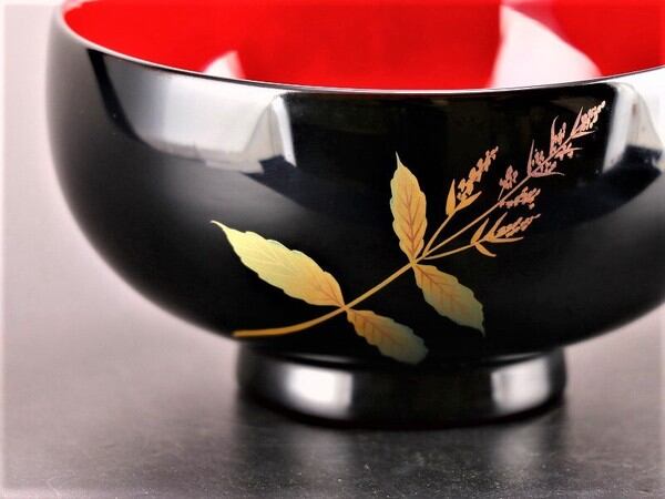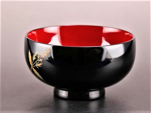 手にぴったり収まるサイズの汁椀。漆塗装なので、熱い汁物を入れても熱が伝わりにくい!お色は黒内朱と朱色の2色。こちらは表が黒色でお椀の中が朱色。お椀の底には十二月二十一日の文字入りです。