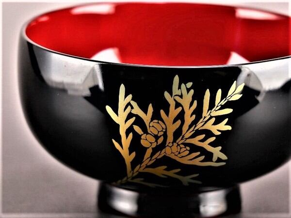 手にぴったり収まるサイズの汁椀。漆塗装なので、熱い汁物を入れても熱が伝わりにくい!お色は黒内朱と朱色の2色。こちらは表が黒色でお椀の中が朱色。お椀の底には十二月三十一日の文字入りです。