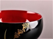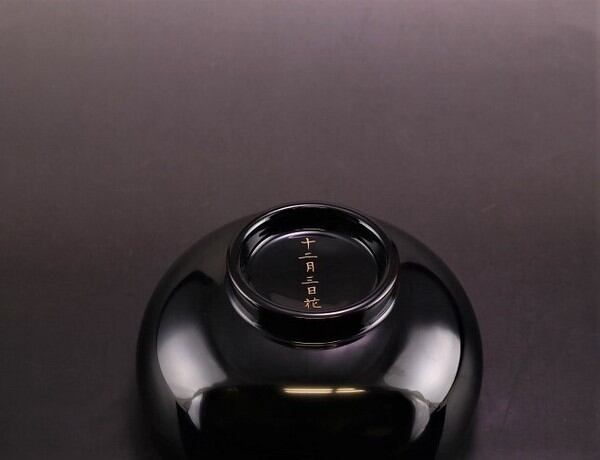 手にぴったり収まるサイズの汁椀。漆塗装なので、熱い汁物を入れても熱が伝わりにくい!お色は黒内朱と朱色の2色。こちらは表が黒色でお椀の中が朱色。お椀の底には十二月三日の文字入りです。