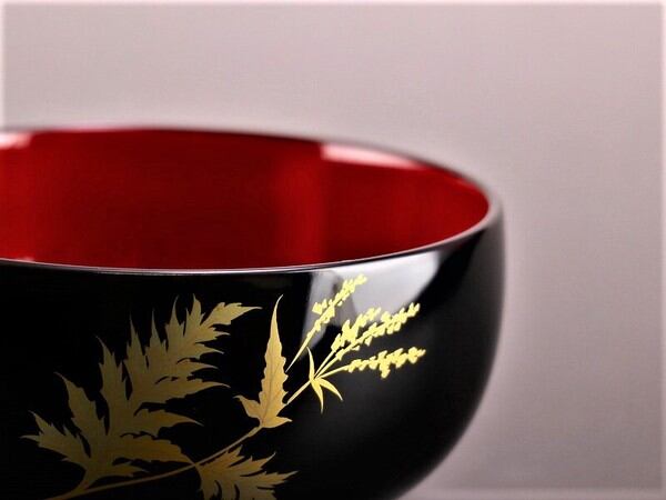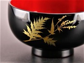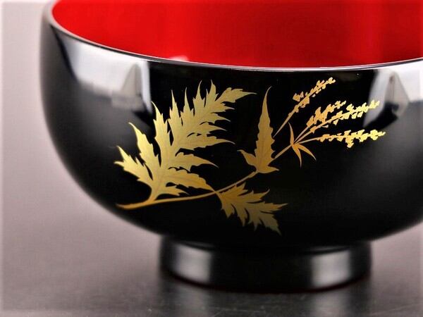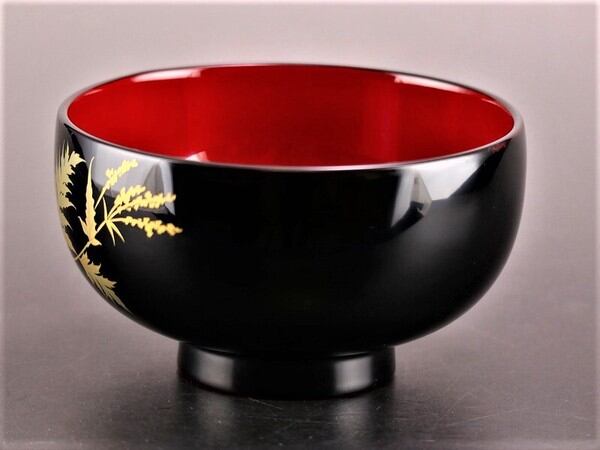 手にぴったり収まるサイズの汁椀。漆塗装なので、熱い汁物を入れても熱が伝わりにくい!お色は黒内朱と朱色の2色。こちらは表が黒色でお椀の中が朱色。お椀の底には十二月五日の文字入りです。