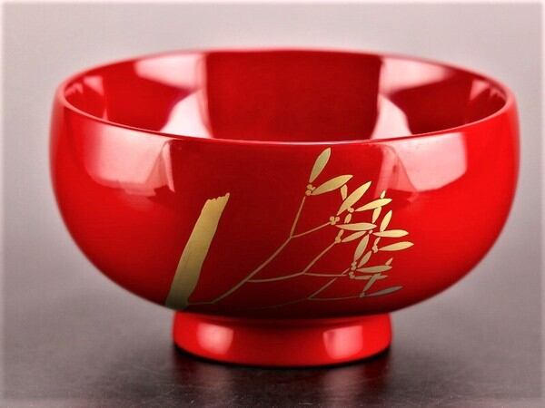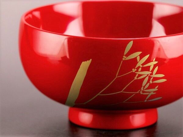 手にぴったり収まるサイズの汁椀。漆塗装なので、熱い汁物を入れても熱が伝わりにくい!お色は黒内朱と朱色の2色。こちらは全体が朱色で底が黒色。お椀の底には十二月二十四日の文字入りです。