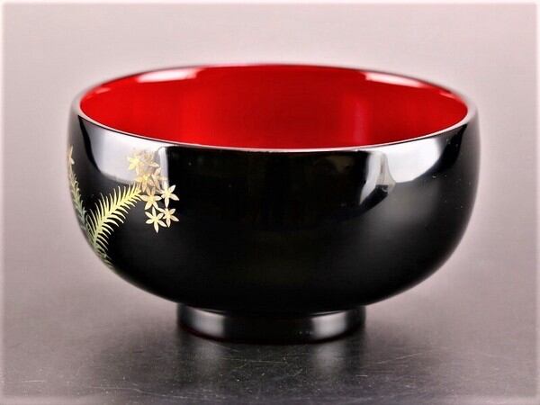 手にぴったり収まるサイズの汁椀。漆塗装なので、熱い汁物を入れても熱が伝わりにくい!お色は黒内朱と朱色の2色。こちらは表が黒色でお椀の中が朱色。お椀の底には十二月十一日の文字入りです。