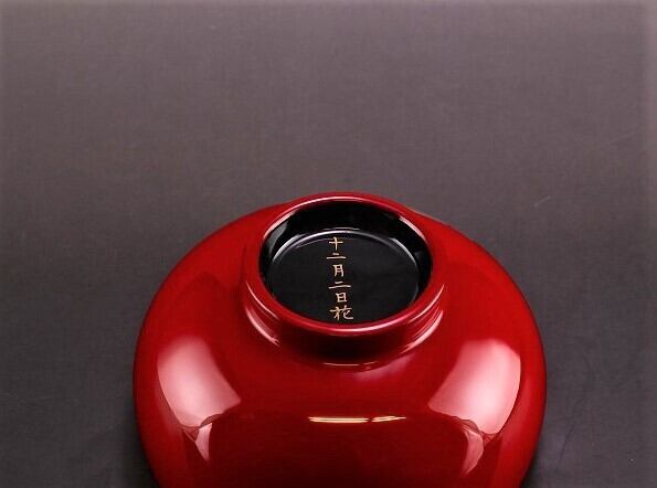 手にぴったり収まるサイズの汁椀。漆塗装なので、熱い汁物を入れても熱が伝わりにくい!お色は黒内朱と朱色の2色。こちらは全体が朱色で底が黒色。お椀の底には十二月二日の文字入りです。