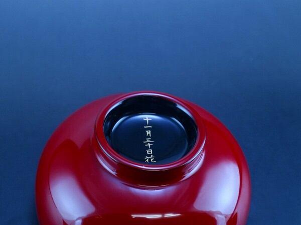 手にぴったり収まるサイズの汁椀。漆塗装なので、熱い汁物を入れても熱が伝わりにくい!お色は黒内朱と朱色の2色。こちらは全体が朱色で底が黒色。お椀の底には十一月三十日の文字入りです。