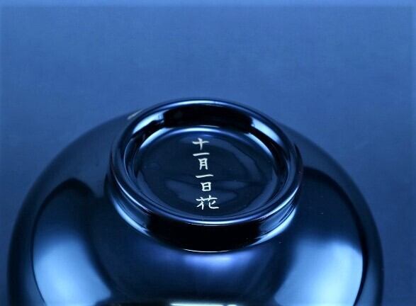手にぴったり収まるサイズの汁椀。漆塗装なので、熱い汁物を入れても熱が伝わりにくい!お色は黒内朱と朱色の2色。こちらは表が黒色でお椀の中が朱色。お椀の底には十一月一日の文字入りです。