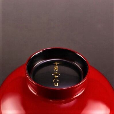 手にぴったり収まるサイズの汁椀。漆塗装なので、熱い汁物を入れても熱が伝わりにくい!お色は黒内朱と朱色の2色。こちらは全体が朱色で底が黒色。お椀の底には十月二十八日の文字入りです。