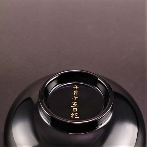 手にぴったり収まるサイズの汁椀。漆塗装なので、熱い汁物を入れても熱が伝わりにくい!お色は黒内朱と朱色の2色。こちらは表が黒色でお椀の中が朱色。お椀の底には十月十五日の文字入りです。