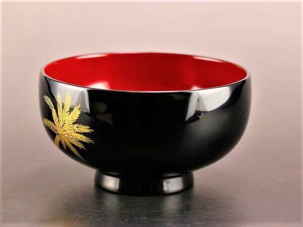 手にぴったり収まるサイズの汁椀。漆塗装なので、熱い汁物を入れても熱が伝わりにくい!お色は黒内朱と朱色の2色。こちらは表が黒色でお椀の中が朱色。お椀の底には十月五日の文字入りです。