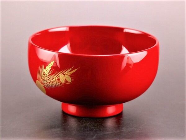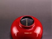 手にぴったり収まるサイズの汁椀。漆塗装なので、熱い汁物を入れても熱が伝わりにくい!お色は黒内朱と朱色の2色。こちらは全体が朱色で底が黒色。お椀の底には十二月十四日の文字入りです。
