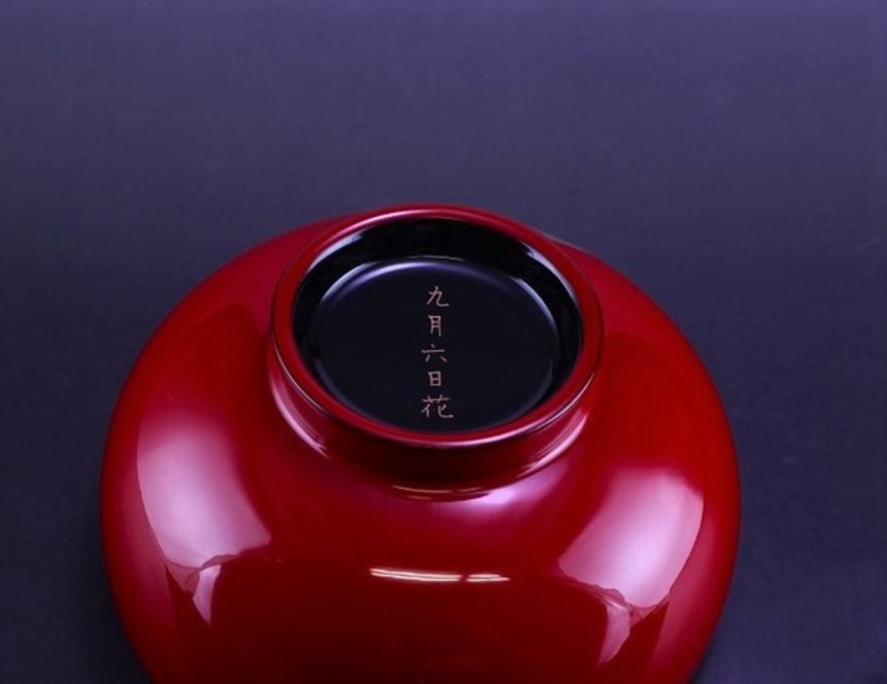 手にぴったり収まるサイズの汁椀。漆塗装なので、熱い汁物を入れても熱が伝わりにくい!お色は黒内朱と朱色の2色。こちらは全体が朱色で底が黒色。お椀の底には九月六日の文字入りです。