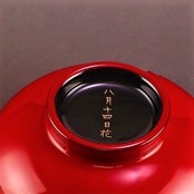 手にぴったり収まるサイズの汁椀。漆塗装なので、熱い汁物を入れても熱が伝わりにくい!お色は黒内朱と朱色の2色。こちらは全体が朱色で底が黒色。お椀の底には八月十四日の文字入りです。
