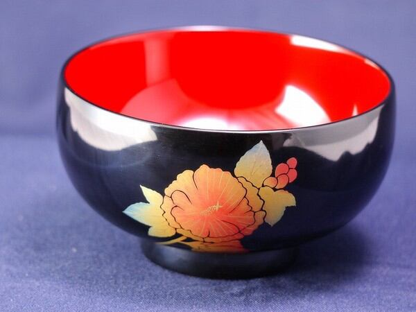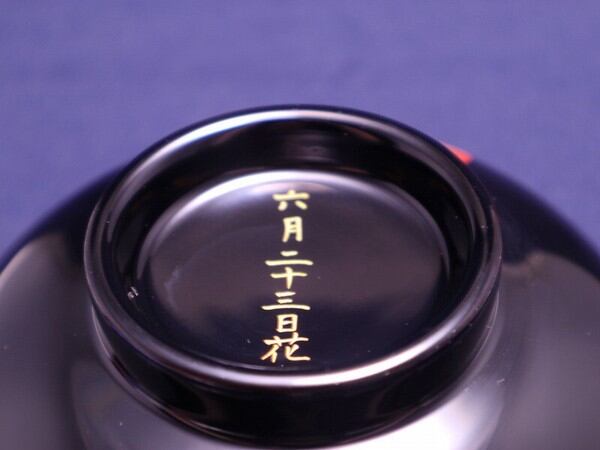 手にぴったり収まるサイズの汁椀。漆塗装なので、熱い汁物を入れても熱が伝わりにくい!お色は黒内朱と朱色の2色。こちらは表が黒色でお椀の中が朱色。お椀の底には六月二十三日の文字入りです。
