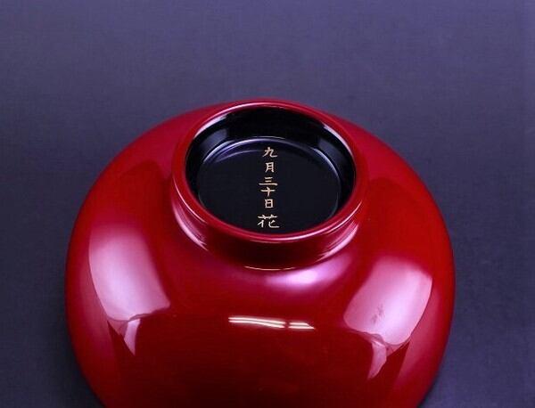 手にぴったり収まるサイズの汁椀。漆塗装なので、熱い汁物を入れても熱が伝わりにくい!お色は黒内朱と朱色の2色。こちらは全体が朱色で底が黒色。お椀の底には九月三十日の文字入りです。