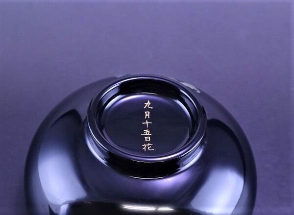 手にぴったり収まるサイズの汁椀。漆塗装なので、熱い汁物を入れても熱が伝わりにくい!お色は黒内朱と朱色の2色。こちらは表が黒色でお椀の中が朱色。お椀の底には九月十五日の文字入りです。