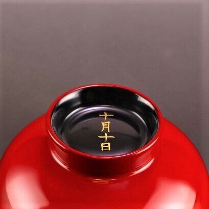 手にぴったり収まるサイズの汁椀。漆塗装なので、熱い汁物を入れても熱が伝わりにくい!お色は黒内朱と朱色の2色。こちらは全体が朱色で底が黒色。お椀の底には十月十日の文字入りです。