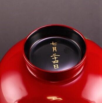 手にぴったり収まるサイズの汁椀。漆塗装なので、熱い汁物を入れても熱が伝わりにくい!お色は黒内朱と朱色の2色。こちらは全体が朱色で底が黒色。お椀の底には七月二十四日の文字入りです。