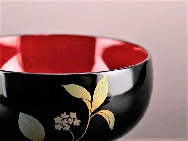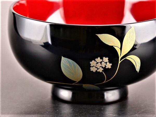 手にぴったり収まるサイズの汁椀。漆塗装なので、熱い汁物を入れても熱が伝わりにくい!お色は黒内朱と朱色の2色。こちらは表が黒色でお椀の中が朱色。お椀の底には十二月十七日の文字入りです。