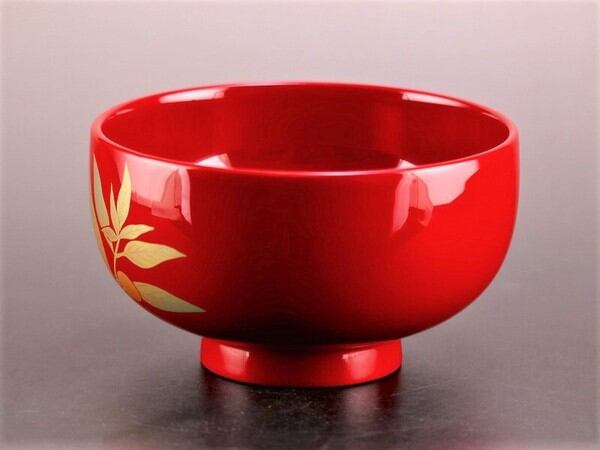手にぴったり収まるサイズの汁椀。漆塗装なので、熱い汁物を入れても熱が伝わりにくい!お色は黒内朱と朱色の2色。こちらは全体が朱色で底が黒色。お椀の底には十二月十日の文字入りです。