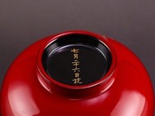 手にぴったり収まるサイズの汁椀。漆塗装なので、熱い汁物を入れても熱が伝わりにくい!お色は黒内朱と朱色の2色。こちらは全体が朱色で底が黒色。お椀の底には七月二十六日の文字入りです。