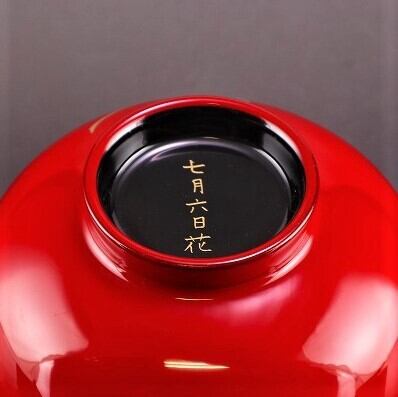 手にぴったり収まるサイズの汁椀。漆塗装なので、熱い汁物を入れても熱が伝わりにくい!お色は黒内朱と朱色の2色。こちらは全体が朱色で底が黒色。お椀の底には七月六日の文字入りです。