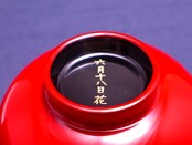 手にぴったり収まるサイズの汁椀。漆塗装なので、熱い汁物を入れても熱が伝わりにくい!お色は黒内朱と朱色の2色。こちらは全体が朱色で底が黒色。お椀の底には六月十八日の文字入りです。
