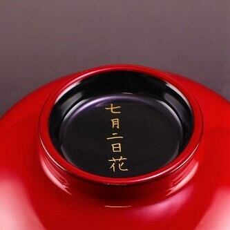 手にぴったり収まるサイズの汁椀。漆塗装なので、熱い汁物を入れても熱が伝わりにくい!お色は黒内朱と朱色の2色。こちらは全体が朱色で底が黒色。お椀の底には七月二日の文字入りです。