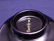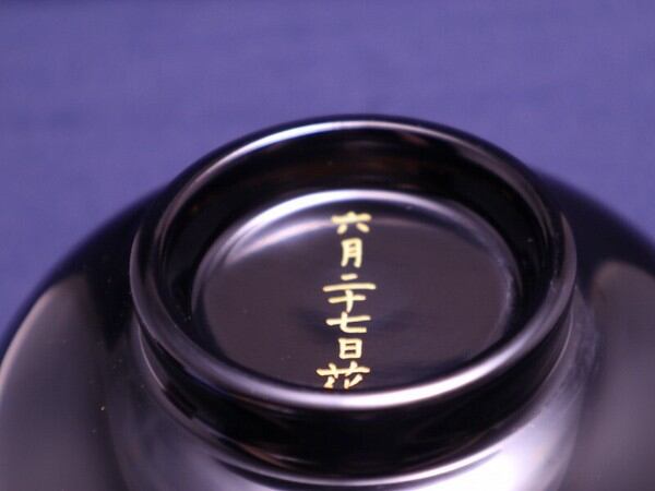 手にぴったり収まるサイズの汁椀。漆塗装なので、熱い汁物を入れても熱が伝わりにくい!お色は黒内朱と朱色の2色。こちらは表が黒色でお椀の中が朱色。お椀の底には六月二十七日の文字入りです。
