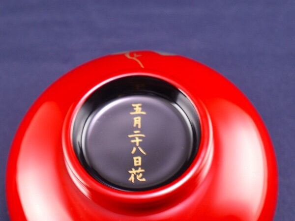 手にぴったり収まるサイズの汁椀。漆塗装なので、熱い汁物を入れても熱が伝わりにくい!お色は黒内朱と朱色の2色。こちらは全体が朱色で底が黒色。お椀の底には五月二十八日の文字入りです。