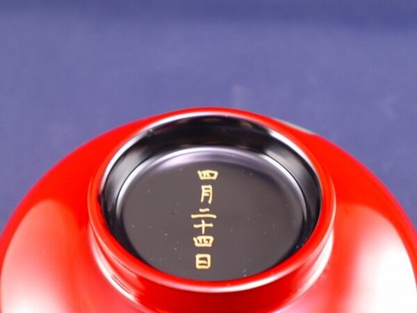 手にぴったり収まるサイズの汁椀。漆塗装なので、熱い汁物を入れても熱が伝わりにくい!お色は黒内朱と朱色の2色。こちらは全体が朱色で底が黒色。お椀の底には四月二十四日の文字入りです。