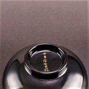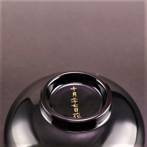 手にぴったり収まるサイズの汁椀。漆塗装なので、熱い汁物を入れても熱が伝わりにくい!お色は黒内朱と朱色の2色。こちらは表が黒色でお椀の中が朱色。お椀の底には十月二十七日の文字入りです。