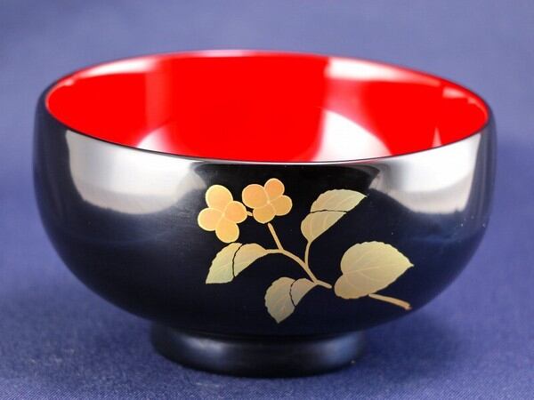 手にぴったり収まるサイズの汁椀。漆塗装なので、熱い汁物を入れても熱が伝わりにくい!お色は黒内朱と朱色の2色。こちらは表が黒色でお椀の中が朱色。お椀の底には五月十五日の文字入りです。